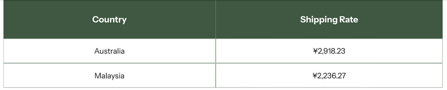 2) Shipping rates assume parcels are 1 kg or less in volumetric weight.